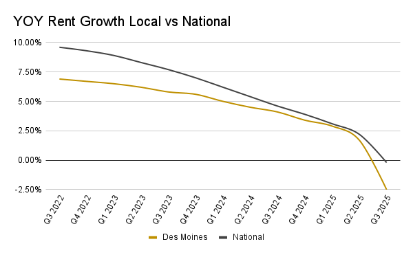 Rent growth has continued to moderate. Q3 rents rose 1.3% quarter-over-quarter, but year-over-year growth decelerated by roughly 2.5 percentage points, dipping below the 10-year annual average of 4.4% and well off the recent three-year peak of 6.5%.