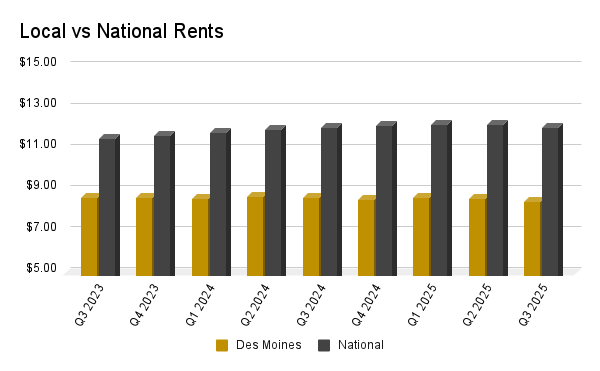 In the Des Moines market, average industrial rent stands at $8.43 per square foot, versus a national average of $12.04 per square foot, which is down nearly 2% since the start of 2025.