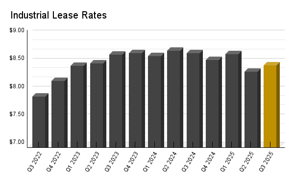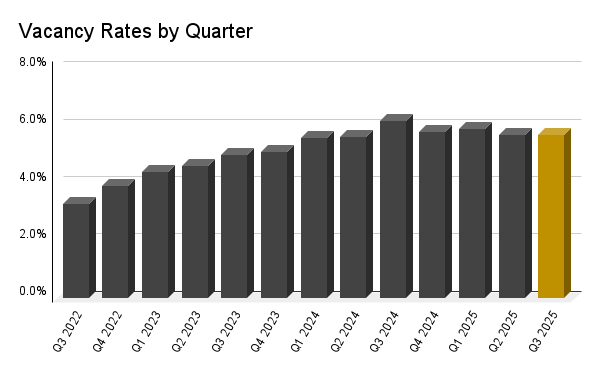 Although vacancy hovered between 5.7% and 5.9% through 2025, the vacancy rate ended Q3 at 5.7% and appears near its cyclical peak as new construction continues to slow.